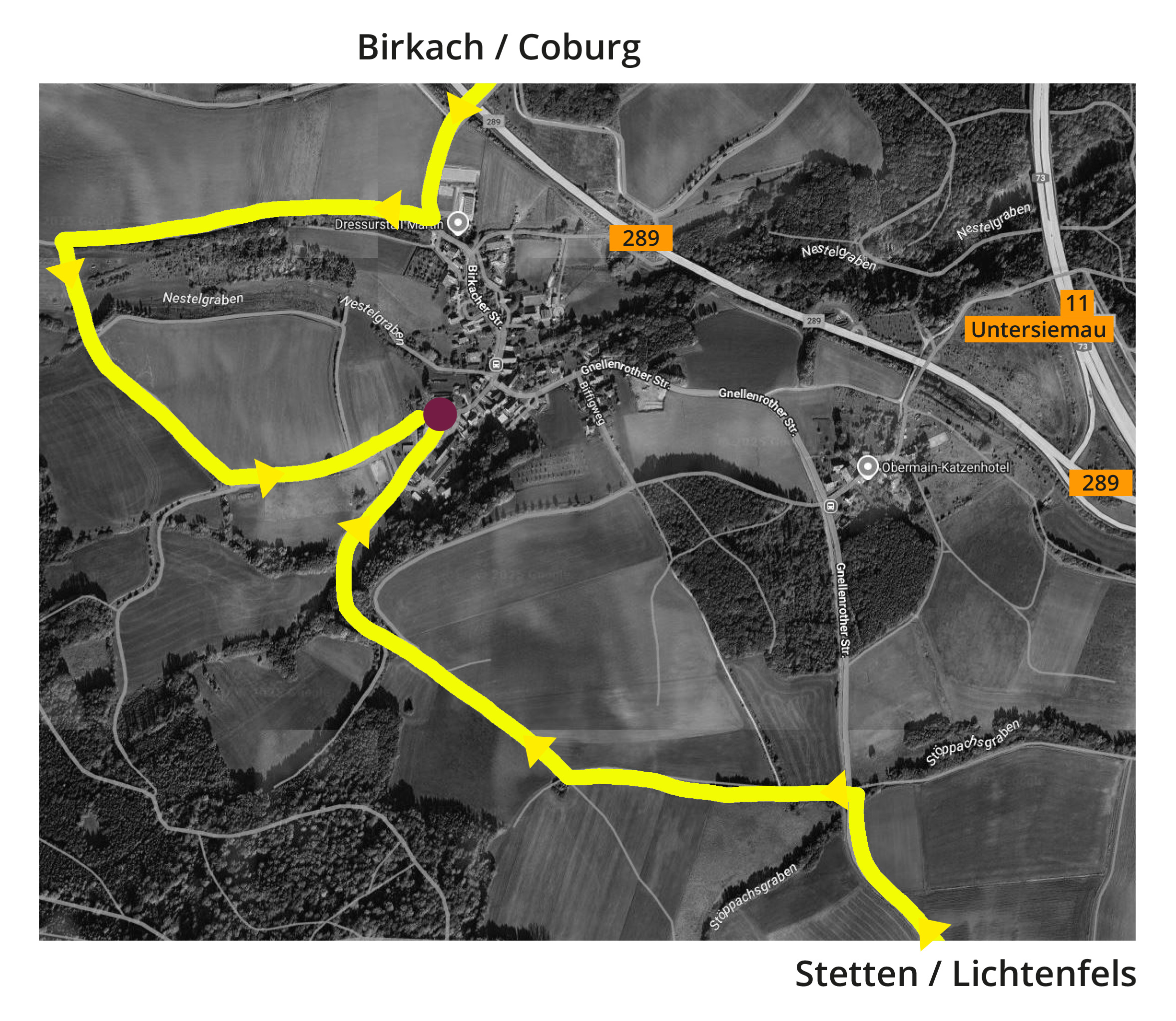 Aus Richtung Bamberg kommend über Untersiemau. Dorfmitte Untersiemau rechts weg Richtung Birkach / Tiefenroth.